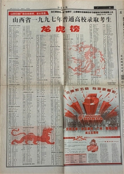 这是一张1997年8月17日出版发行的《山西日报》,该报在第四版上刊登着山西省1997年普通高校录取考生龙虎榜,正好这一年也是我女儿参加高考之年。这龙虎榜它不是一次性公布当年所有的招生录取名额,而是根据各大院校招生时间的不同来分期分批地进行公布。当我在这张报纸上看到华东师范大学录取名额中有我女儿牛媛媛的名字时,我惊喜不已,当时的那种激动的喜悦心情真的是难以用语言来表达。