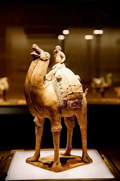 山西博物院《民族熔炉》展厅里有一尊胡人骑驼吃饼俑,我第一次见着就喜欢,太形象、太有画面感了,活脱脱一个“干饭人”。于是持续关注,发现它动不动便代表山西博物院外出参展,是山西博物院的明星展品。