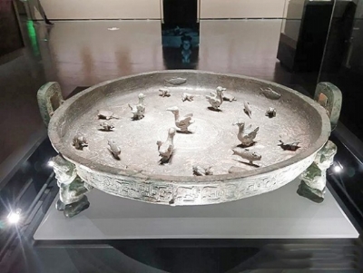 晋公盘,青铜礼器,口径40厘米,盘面上有若干小动物,倒上水,这些小动物便能360度旋转。更为珍贵的是,盘内壁有七处铭文,记载了晋文公时期晋国的盛世气象,为我们传递了极为珍贵的历史信息。
