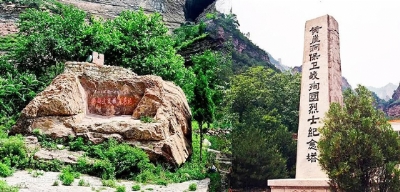 一会儿,我们已行走到黄崖洞的对面时(只能隔沟仰望),在洞的左侧有“黄崖洞”红色三字,是邓小平的亲笔题名。提到黄崖洞及黄崖洞保卫战就不能不提起兵工厂。兵工厂位于距黄崖洞1.5公里的西北方,海拨1283.25米。说话间导游指着前面一排全是石头垒的房子说,这是当年军工们工作休息活动的场所,墙上当年日军用炮攻打的黑烟弹孔清晰可见。现在这里住着一位守墓人赵爷爷,今年87岁,守墓已30年有余,每天早晨6点就起床打扫陵园。每到清明节,赵爷爷就会买上鲜花水果去扫墓。