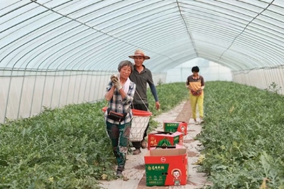 代李青村麒麟西瓜种植园占地450亩,建拱棚398座,采用“党支部+合作社+企业+农户”的新型经营模式,统一选苗、统一培育、统一标准、统一销售的规范化管理模式。麒麟西瓜肉质新嫩、香甜多汁,保鲜时间长,商品性好,深受消费者喜爱。据介绍,麒麟西瓜每年种植可两茬,亩产量达12000斤,每亩净收入达26000元,较以往种植玉米,农户收入增长了21.6倍。麒麟西瓜种植园区的成熟发展,为代李青农户打开增收致富门,成为集义瓜果之乡“出圈”的新名片。