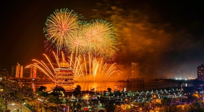 康兴成天空绽放丽琼花,堪比初升旭日霞。孔雀开屏迎瑞气,大鹏展翅送福佳。万千鸣箭冲霄汉,无数金星烁宇华。乐赏多姿芳灿景,犹如细品雨前茶。