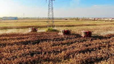 高粱地里,成片的红高粱穗粒饱满,一台台收割一体机往来穿梭在田间,有序进行着摘穗、脱粒、装车等工序,红彤彤的高粱勾勒出一幅绝美丰收景。