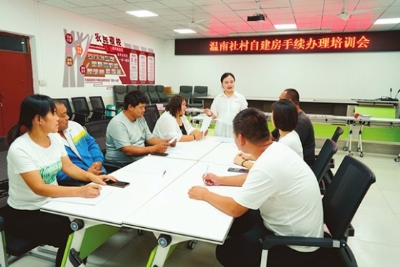 李萌(中)在温南社村自建房手续办理培训会上作指导。