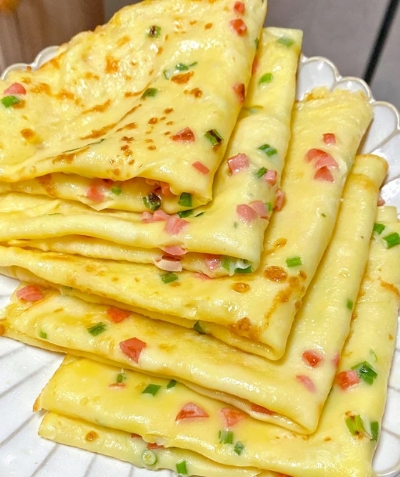 煎饼是旧时乡人早、晚饭的主食,百吃不厌,品种花色很多。有玉茭面的,高粱面的,还有高粱面、豆面、麦面三合一的。用料不同,味道也不一样:玉茭面的松软绵甜,口感有如食品店里的蛋糕;高粱面的一般要加点盐和调料面,味道淳香;三合面的又是一番风味,薄的像纸,营养丰富,又好消化,给老人、病人、坐月子的妇女吃最为适宜,庄户人是当作上档次的营养食品看待的。煎饼的制作方法很讲究,选料精,加工细,单就摊煎饼这道工序,就要掌握下料不多不少,摊得不厚不薄。巧媳妇做出的煎饼连尺寸大小圆弧形状也一个样,而且带几分艺术性,给人以审美感,当然就会勾人垂涎,食欲大增。