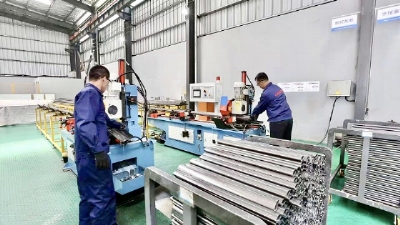 图为山西同盛达暖通科技有限公司员工正在生产供暖设备