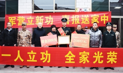 本报讯建功在军营,喜报送家中。1月19日,县人武部、县退役军人事务局、96608部队敲锣打鼓联合为荣立战备训练三等功现役军人焦英健家庭送去立功喜报、奖励金和新春问候,表达了部队和地方政府对军人军属的关心和祝福。