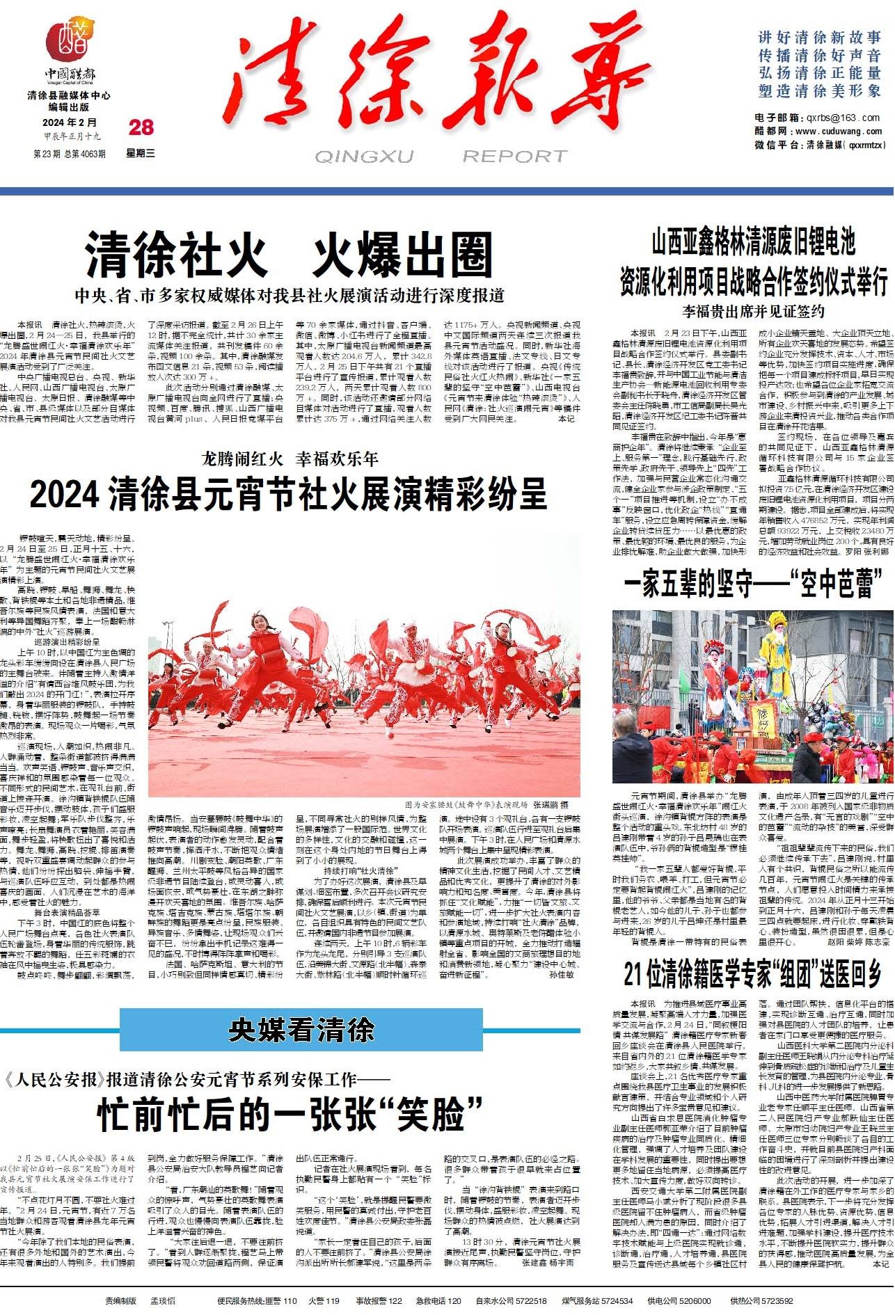 本报讯清徐社火,热辣滚烫,火爆出圈,2月24—25日,我县举行的“龙腾盛世闹红火·幸福清徐欢乐年...