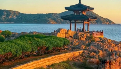 最后,我们来到百步沙。这是一个美丽的月牙形海湾,沙平水静,是一处天然的浴场。沙滩上有巨石伸入海中,临水处的岩石上刻有“师石”,旁边刻的“回头是岸”,寓意要以石为师,学习它的刚毅坚韧精神。浴场两端筑有造型古朴的休憩小亭,飞檐高翘,遥相呼应,把海滨浴场烘托得格外清丽。我们走累了,来到亭中休息。站在亭中极目远眺,天吻山,山依水,大海深处帆影点点,海天一色,海鸥竞翔。阵阵潮音中,浪拍金沙,席卷连绵,好不让人心旷神怡!小憩之后,我们踏上沙滩,惊奇地发现,这里的沙子细细的,软软的。陆导告诉我们,明代屠隆曾写下赞美百步沙的名句:“黄如金屑软如苔,曾步空王宝筏来;九品池中铺作地,只疑赤足踏莲台。”