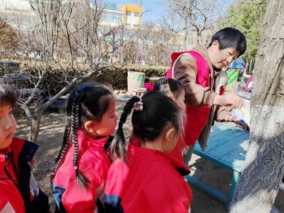 2024是3月12日是第46个植树节,为防止树木遭受害虫啃咬,清源幼儿园师幼动手给幼儿园树木添“新衣”。