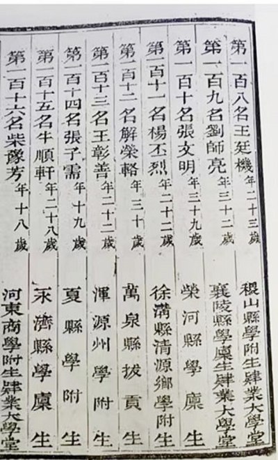 那张照片是齿录中的半页。齿录是科举时代同时考中者的类似通讯录的简介类资料,记录的是考中时的个人情况,没有之后的信息。虽然遮挡了半边,但还是可以看清被挡的是其祖父、父亲的情况。据此,可知杨丕烈(1880年—?)字农山,号餐梅,是长子。他出生于光绪六年,父亲是太学生,当过翰林院待诏的九品小官,退休后还被选为乡饮大宾,属乡村宴饮时地位尊崇的荣誉身份。杨丕烈中举人时只有22岁,有一女名玉香,尚无儿子。他中举以后的发展情况无法查到。由他的姓氏为杨分析,他有可能是清源县杨姓聚居较多的阎村或杨房一带人氏,当然仅是推测。