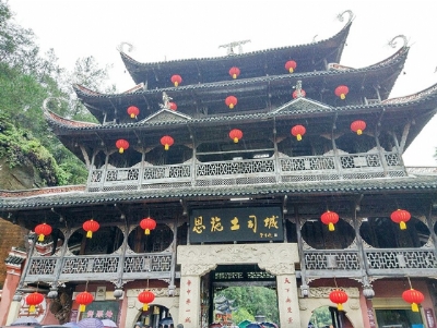 我们跟随导游阿平,行走在土司城墙上。城墙全长2320米,宽1.2米,依山取势修造,逶迤延绵,厚实坚固,似苍龙盘环,将土司城护卫得固若金汤。土司时期,各土司为发展壮大经济实力,一方面广泛开垦荒地,发展生产;另一方面又相互间争田夺地,甚至劫掠百姓,扩充劳动力,造成土司间攻城掠寨的战斗不断发生。各土司修筑城墙、寨墙进行戍守,就成了重要的防护手段。在城墙上还广设烽火台,实行狼烟报警,土司兵丁闻讯集聚,抵御来犯之敌。钟楼位于城墙最高处,为3层亭塔式建筑,底层为城墙,中层为城楼,顶层为亭。亭内悬一口重达3000余斤的大铜钟,叫土司朝典钟。钟上铸有999字铭文,记述了土司城各景观的壮丽和感赋远古巴人、及巴人后裔土家族慷慨悲壮的沧桑历史。土司朝典钟主要用于:土家族神和历代土司祭祀;用于朝庭册封的新土司登位的朝贺;也用于每年岁时中祈祷上苍免除水旱虫灾。凡此,每当钟声响起,土司便率领土司文武职官及王室宗亲、兵丁土民一起梵香朝拜,十分隆重而神圣。