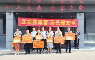 本报讯军营创功绩,家乡传美名。7月23日上午,县退役军人事务局联合县人武部为13名荣立“三等功”的现役军人家庭送去喜报及慰问金。