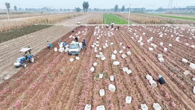 10月16日,清徐县徐沟镇清德铺村红薯产业基地,村民们正在收获红薯。今年,该村红薯喜获丰收,亩产量最高达4000公斤。张昊宇摄