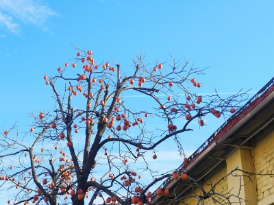 收获的季节里,光秃秃的枝条上缀满了金灿灿的柿子,一串串的,一嘟噜一嘟噜的,因为太高,须仰望,然后,树后面的背景:一排整齐的平房教室,红瓦绿树,还有碧空如洗的天空,与眼前果实累累的柿子树,构成了一幅绝美的图画,这自然的画卷,用“美艳”来形容还是不够的。每年到了这个时节,老师们都会到此驻足、惊叹,纷纷拍照,拍下自己青春的模样,拍下孩子们快乐的身影。