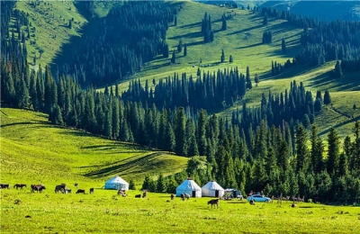 天山腹地孕育着世界四大高山河谷草原之一那拉提草原,这里有雪山、有森林、有沟谷、有草甸……拥有“哈萨克族的摇篮”之美誉。这里的草,漫山遍野,给山岭涂了底色,这底色是浓郁的绿,有纹理,有生命,会随着山势地形的起伏吞吐明暗浓浅,但始终不遗余力,时而密密匝匝,时而轻轻疏疏,时而如绿波涌来冲击着你的视线,时而如绿毡幔帐平平缓缓。这大概是上天赐予人间最生动最活泼的颜色,也是上天赋予人间最饱满最广阔的颜色。草是绿色的精灵,带着生命的灵气,在这里欢唱,歌声似雪山吹来的风之天籁,空灵而畅快。茂盛的松树、柏树、桦树,凝聚着这里的绿色,一丛丛,一群群,一片片,落在山凹里,落在山腰间,落在山顶上,让草原辨识度高起来、绿色立体起来,似草原凝成的碧丛,又似大山放养的精灵。我们坐着区间车,迎着风,盘着山,一路向山顶奔去。山,重峦叠障,爬高一层山,又多一群峦,沟谷纵横,森林茂密,山谷开阔空灵,山峦连绵不绝,站在山间,云雾缭绕,人与天越来越近,草依然葱郁,斜斜地在脚底下的山坡上蔓延,一直到深不见底的沟谷;树依然丰茂,直直地在身边山腰上生长,一直到望不见边的山顶,真有“登东山而小鲁,登泰山而小天下”之感。人立于天山间,面对大山的广博,山谷的幽深,草的连绵,树的浓郁,风的苍劲,方知自己的渺小,似沧海一粟。白白的毡房坐落在绿绿的山坡上,阳光一晃,白的亮眼。远眺山间,游客骑着骏马上山,马蹄声如此悠扬,欢快声如此轻灵;仰望天空,明亮而纯净的蓝天上飘着洁白轻盈的云朵,不由得让你想伸手摘一朵属于自己的云花。此时,雄鹰盘旋而来,展翅飞翔,我挥起手大吼一声,“哎,雄鹰,你好啊!”人似乎只有置身于这广阔的天地里,才能自由,才能发出心底的声音,才能回归自然,与那鹰对对话。这里的草,这里的树,用绿色在大山间挥毫泼墨似得涂染着,涂染着深浅明暗,涂染着高低起伏,将本不具生命的色彩泛化成灵动起伏生生不息的生命。人类在这里繁衍生息,用他们的勤劳与善良,勇敢与智慧,敬畏与开拓。乌孙大营里载歌载舞,演员饰演着角色,一笑一颦间,一舞一跳间,用现代的表达方式讲述着历史故事,用现代的热情唤醒人们探索乌孙部落的热情。来吧,一起舞蹈,带你走进乌孙大营,体验民俗风情,享受民族舞的快乐!上天赋予新疆戈壁与艰辛,也赋予新疆雪山草原与生机。戈壁让人绝望,人们在绝望中思考,在思考中凝聚智慧去探索,在探索中改变创新,在改变中繁衍生息。在艰辛的生存之路,他们遇到了天山,遇到了溪流,敬畏着山,敬畏着雪,在甘泉润物中创造了草原的奇迹,创造了森林的奇迹,创造了人类的奇迹。这里人们生活安详,不然,四年级的唐努儿小姑娘不会抱着她的小羊与游人欢快地合影,不会无拘无束地讲述她上学的故事。
