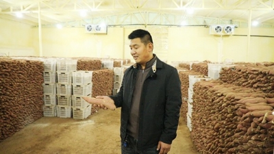 在我县徐沟镇杜村,有一座占地面积达4万立方米的冷库。在这座冷库中,一颗颗形态规整、大小相仿的红薯被精心地码放成一座粉红色的“山峦”,其表皮光鲜亮丽,色泽分外诱人。此时,农场主亢小强正忙得不亦乐乎,他随手拿起一颗硕大的红薯热情地介绍道:“看,这是我们精心培育的普薯32号,也叫‘西瓜红’,煮熟后口感无筋无丝,软糯香甜,是烤红薯中的佼佼者,深受消费者喜爱。而在另一边堆放的秦薯5号等,也是我们引进的新品种。”