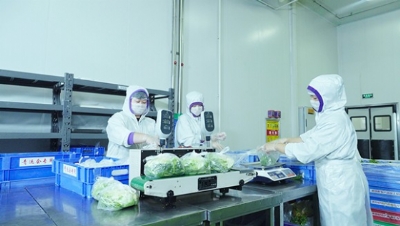 白菜、辣椒、红萝卜、土豆……在上万平方米的仓库内,近百种蔬菜整齐堆放着,叉车往来运输,一派繁忙。记者仔细瞧了瞧,这些包装整齐的蔬菜十分新鲜,没有坏叶烂果,在低温的呵护下,还散发着地里的泥土香。工作人员热情地介绍,“这些蔬菜除了直供超市外,还有一部分将作为原料被送到车间流水线上进行深加工,等再见到它们时,就已变成超市货架上预制菜的一部分了。”