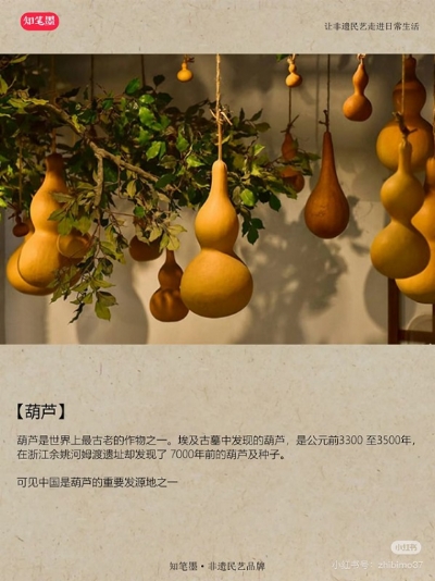 葫芦,现代词典的注解为攀援草本,雌雄同株,广布世界热带到温带地区,我国各地均有栽培。瓠果成熟后果皮木质而硬,可作各种容器,亦可药用。一种上小下大双球型的葫芦更是被称为“中华葫芦”,历史赋予它各种神秘力量和传说,更有众多能工巧匠利用精巧的技艺,将它精雕细琢成一个个工艺精品,呈现于世。
