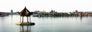 我们穿过午门,映入眼帘的是两湖碧波荡漾的湖水,令人心旷神怡,豁然开朗,这就是著名的潘、杨二湖。关于它们的由来,民间还流传着一段美丽动人的传说。相传北宋太宗年间,这一路之隔住着两位朝中重臣,东边住的是开国元勋潘仁美,西边住的是抗辽英雄杨业。由于潘仁美嫉贤妒能,害怕杨业功高望重,地位超过自己,于是就在一次抗辽作战中陷害杨业,使其战死沙场。佘老太君在告状无果的情况下,带领全家罢官归隐。恰恰就在此时,天上下了3天3夜暴雨,将这一路之隔的两府,淹成一片汪洋。这正好应验了中国的一句老话:恶有恶报,善有善报!有趣的是,东边的湖水混浊,西边的湖水清澈。由此,就有了民间流传的“潘杨湖水辨忠奸”的故事。连接二湖的是玉带桥,南北长40米,东西宽18米,高7米。我登桥四望,水天一色,东边可远望巍巍铁塔,西可近观开封翰园碑林和天波杨府,正北方向便是雄伟壮观的龙亭大殿。