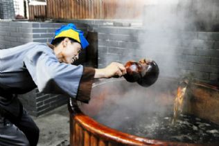 接下来的展厅里身着明时服饰的工作人员在一项一项演示老陈醋传统酿造的道道工艺,高粱、豌豆等原料经过石磨研磨、石碾碾压,再由独轮车运输,经过蒸料、酒醅、熏醅、淋滤等工序,最终酿造出山西醋来。而由山西醋变成老陈醋还要经过一年的冬捞冰、夏伏晒周期才成。然后经过五年、十年,甚至二十年的陈酿,怪不得手工造的醋一斤会卖七八十的高价,其实是物有所值的。