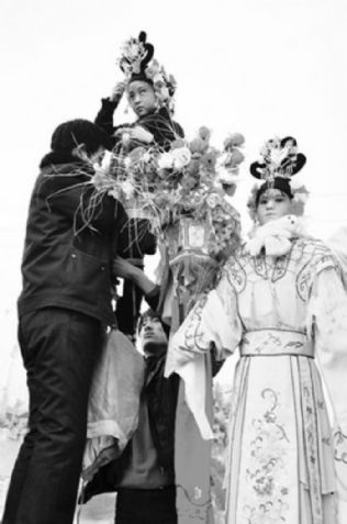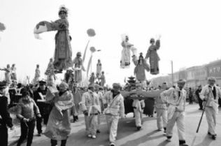 又有扒棍,以多人抬木架,架上有巨横梁,枕以三四丈之长篙,中与横梁加活动之枢,其篙之尖端在前,以骑鹤童子缚之。其下端在横梁之后,以多人徒手执之。视前方屋上有妇女,则使篙尖之骑鹤童子挥尘近之,杂以谐语。