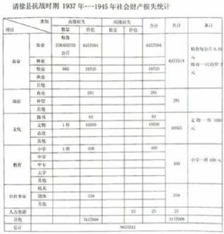 山西省档案馆档案记载的晋绥八分区1946年调查的抗战时期,日军给清源县、徐沟县造成的财产损失情况统计: