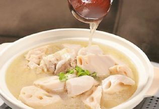 [做法] 把猪脊骨洗净、剁碎,放沸水锅里焯一下,捞出。去藕节和表皮,洗净、切片。猪脊骨放在锅里,加水适量。用大火煮沸,撇掉浮沫,添加精盐、黄酒、葱段、生姜片,再用小火炖煮到肉离骨,捞出骨头、拆掉肉,捅出脊髓。把脊髓、藕片放在汤中炖熟,拣去葱、生姜,添加味精即可。