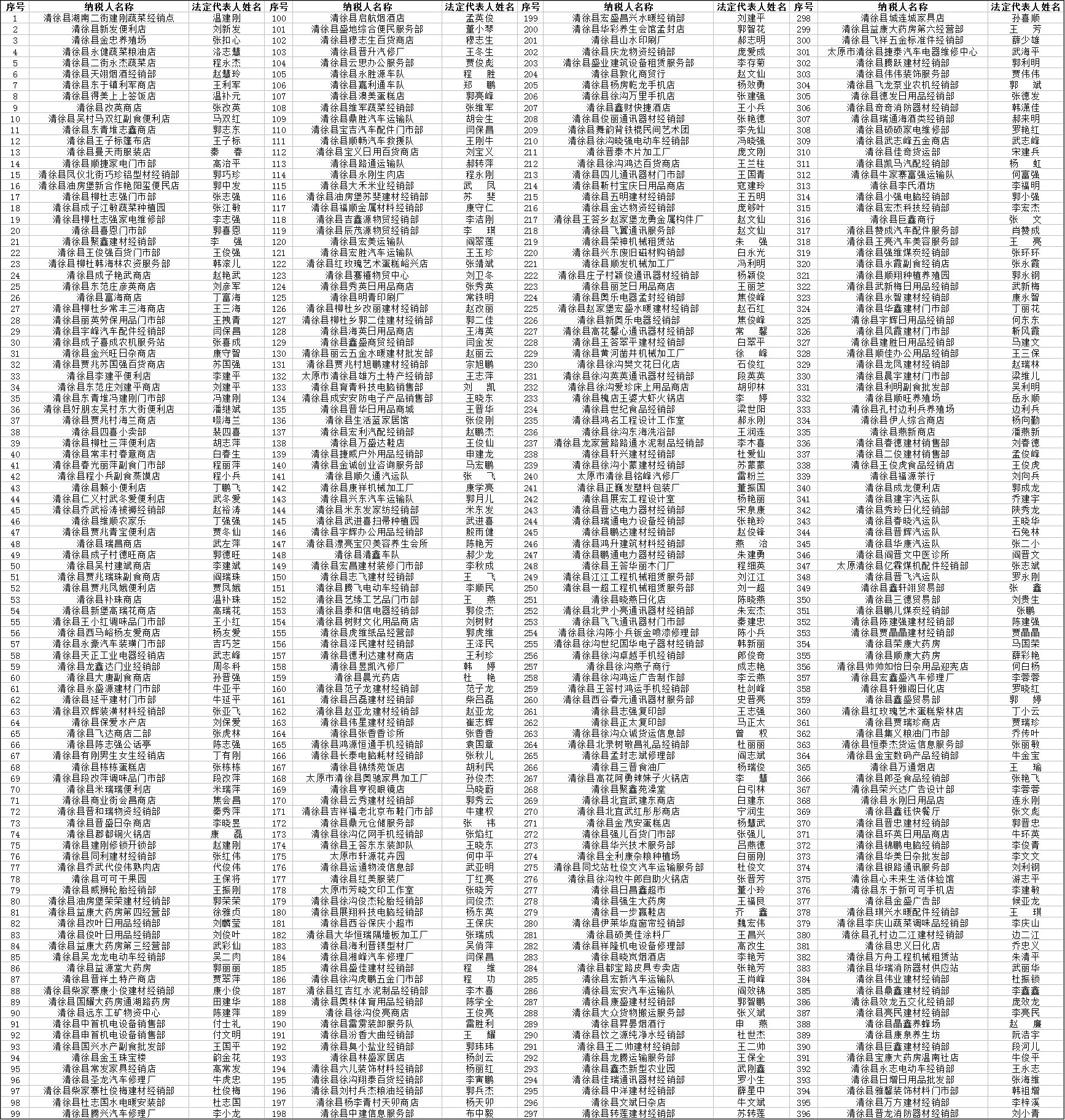 根据国家有关税收法律法规的规定,我局对无正当理由至今仍未办理税务登记的以下名单所列纳税人,进行责令限期改正处理。因同一事项送达纳税户较多,根据《中华人民共和国税收征收管理法实施细则》第一百零六条规定,现将逾期未办理税务登记且下达《税务事项通知书(责令限期改正)》的纳税人进行公告,并送达催办税务文书,责令其自公告之日起三十日内到我局履行其税务登记义务,持工商营业执照、法人居民身份证及其复印件等相关纳税资料到清徐县地税局办税服务厅办理税务登记。自公告之日起满三十日,即视为送达。有关纳税人应迅速履行办理税务登记等有关事项,对逾期仍未按规定办理税务登记的纳税人,我局将依照《中华人民共和国税收征收管理法》第六十条有关规定,提请工商行政管理机关吊销其营业执照。