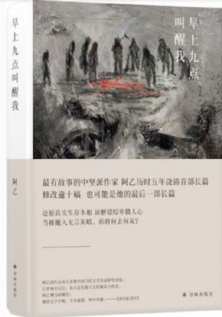 小说名来源自阿乙读过的博尔赫斯的一本访谈录。博尔赫斯提到要写一篇短篇小说,题目叫《早上九点叫醒我》。但在博尔赫斯的作品里,阿乙并没有发现这部小说,便就用这句话——早上九点叫醒我——做书名。小说里,主人公宏阳喝醉后,向自己的内人叮嘱,让她做一个人体闹钟,到了早上叫醒他。次日晨,等到要叫醒他的时候,他的内人发现他已经死了:他把自己喝“死”了。小说由此开始……
