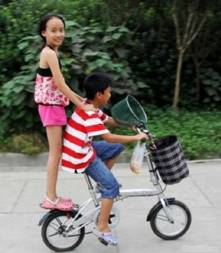 在我印象中,没有人教过我骑车。起先,自行车后轮上还安着两个小轮,骑起来相当稳。就那样骑了好几天,有了骑车的感觉后,就让爸爸把多余的两个后轮卸下来,可是,怎么也骑不起来。就让小伙伴给我在后面把着,双眼直勾勾的注视着前方,不敢松懈。就这样,跌跌撞撞了一下午终于不用别人扶着也可以向前骑了。刚可以骑了,就不自量力地让小伙伴坐在后座上,带着她骑。起先还好,到了后来她在后面一动,我就把持不住了,车把来回晃动,伴随着两声尖叫,我带着小伙伴冲向了车库的大门,我还负了伤。
