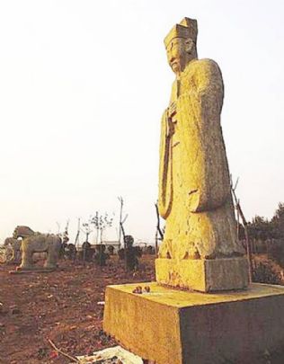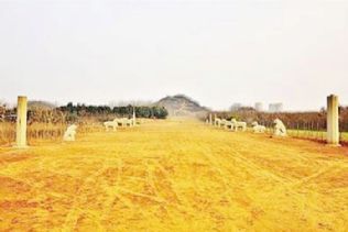 按照老乡的指点,我们来到了大府井村附近,抬头便看见远处空旷的麦田里散落着六七个土坟冢,中间有一处大冢,是用黄土夯筑成的圆土堆,上面丛生着荆棘和野草。墓冢坐北向南,封土高约20米,周长足有近200米,整个陵区布局紧凑,保存还算完整,墓前神道两旁是威武的石像生,石像生显得很高大,造型刻工极精美,足以折射出陵园昔日的风采。