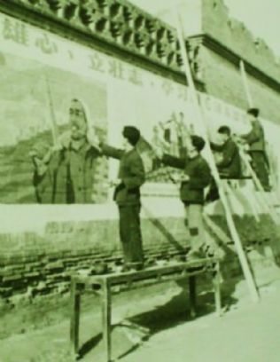 图⑦山西大学美术系师生正在小武村绘制宣传壁画《陈永贵》。(1964年拍摄)
