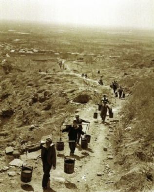 图①我县边山一带农民担水上山,进行抗旱保春播生产。(20世纪70年代拍摄)