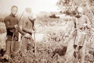 图⑤徐沟县农试试验场员工正在使用喷雾器(1940年拍摄)