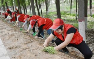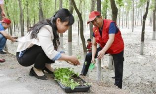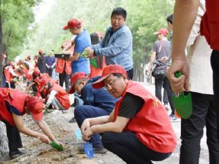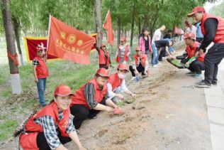 劳动现场,身穿红马甲的志愿者与猎猎飞扬的队旗在高鹅路两旁一字排开,大家争先恐后,手拿小铁铲,刨坑、栽花、浇水,栽植了蜀葵、波斯菊等小花苗。