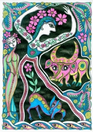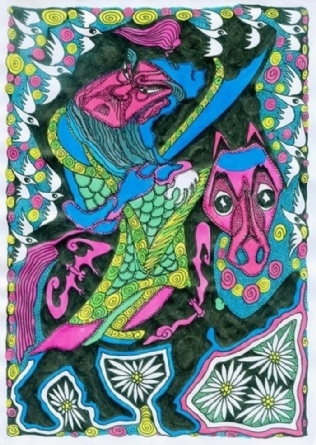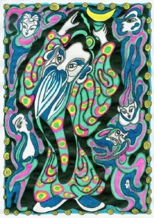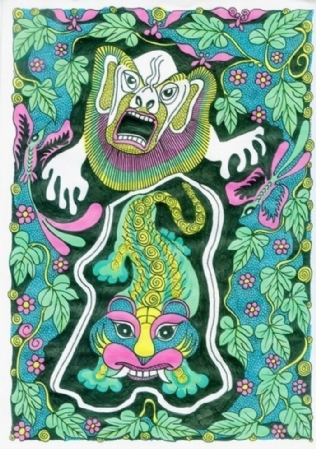 老杨的“老年童画”,其创作意境与内涵,可从其曾经写过的一篇文章《人到七十之“老年童话”》中窥得一斑:“一个人生命的过程,便是从生到死具体表现的过程。人到‘暮年’,是否还怀有‘壮心’,是观察他意志坚强不坚强的窗口。总想在‘老年童话’中赋予一种将老年人与儿童思维混合搅拌的寓意,即让儿童天真好奇的幼稚思维,重新返回老人颅腔,促使其欢乐喜悦、蹦蹦跳跳、笑口常开、童趣再现;促使其颅腔中的思维升腾活跃。向高,欲登珠峰,向低,欲探地核。欲揭时空之寿限,欲摸宇宙之边沿。如果真能这样,那可就越老越值钱了……”