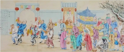 正月十五大早起来,长腿六叮嘱伙计们饭吃得硬些,因为今年路程远些,再者全村路线长,大小路径基本通过,可能回来要晚些。另外又叫了两个人帮忙抬船,大家到时候准时到十字街起身。