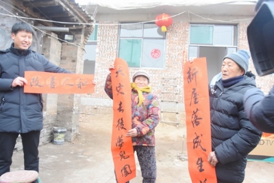 1月20日上午,清徐县孟封镇闫家营村,清徐县委宣传部、邮储银行清徐支行的工作人员来到D级受灾重建户郑耀贵家,把电视机、春联、福字送给老人。