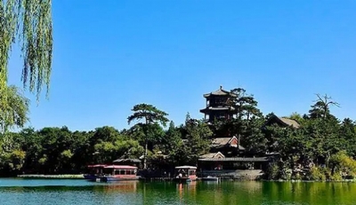 湖区位于山庄东南部,占地866亩,现有七湖八岛。岛屿将湖面分割成大小不同的区域,湖水变幻,洲岛错落,亭桥掩映,碧波荡漾,一派江南水乡的秀色。湖区的风景建筑,大多是仿照江南的名胜建造的。如芝径云堤仿自西湖,文园狮子林仿自苏州,金山岛仿自镇江,烟雨楼仿自嘉兴,文津阁仿自宁波天一阁。这座玲珑秀丽的建筑叫“烟雨楼”,二楼上的云龙金匾是乾隆题写的,在阳光的照耀下,熠熠生辉。还有演《还珠格格》小燕子的“簌芳斋”,尔康和小燕子捉迷藏的狮子林。印象最深的还有文津阁,此处曲水荷香,静谧幽雅,文津阁楼前的水池还有“日月同辉”奇景。据说每年农历八月十五,乾隆皇帝来此,白天欣赏水中的“弯月”,夜晚欣赏空中的圆月,两个月亮,一真一假,一圆一缺,极为有趣!山庄的东北部,是闻名遐尔的热河泉,史书上记载它是“世界上最短的河流”,全长只有60多米。泉边的石碑上,写着“热河”两个红色的大字,众游客纷纷与此石拍照留念。因为泉水温热,又有上游的温泉水汇入,所以冬天也不结冰。尤其是周围白雪皑皑时,这里的湖面却热气蒸腾,实为奇观!