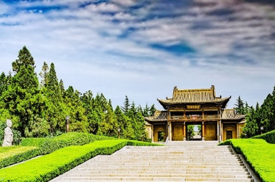 进了彩虹门,就是舜帝公园,中间为宽阔平坦的神道,长约1000米。神道两旁是景区,由百花园、植物园、历山、条谷苍野、雷泽湖、妫汭河以及游乐场、猴山等组成。景区内松柏苍翠、百花争艳、波光粼粼、鸟语花香。景观水系贯穿南北,皋、夔、稷、契4座拱桥与湖光山色交相辉映,无不彰显北方园林建造者的智慧。沿神道前行,我们来到陵庙的山门,这是拜谒舜帝陵庙的第一道大门,一座两层建筑,是在原址上重新恢复的仿清建筑。山门匾额上的“舜帝陵庙”4个大字是中国书法家协会主席沈鹏所书。山门对联“此是鸣条岗,春露秋霜怀复旦;谩言苍梧驾,尧天舜日睹重华。”