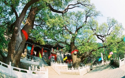 山门前的两株古槐,相传为寺院高僧于隋开皇十六年(596年)所栽。东侧古槐龙形,西侧凤形,龙腾凤舞,伸着臂膀,似在迎接我们的到来。1400多年的风霜雪雨,古槐皮似鳞,枝如铁。如铜的杆曲来扭去,如蟒走蛇行。清顺治年间,知县和羹为清源新增八景题写绝句,其中一首为《山寺槐阴》,诗曰:“饱经风霜不记年,鼓柯振叶上参天,法王宫下樵苏少,况是深山地处偏。”和知县诗中所咏,便是这山门前的双槐。说明早在三个半世纪前,就有人对这两株古槐大加褒嘉并作诗记之了。