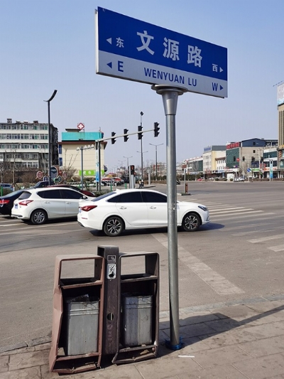 文源路与梗阳大街交叉口,垃圾桶破损变形。