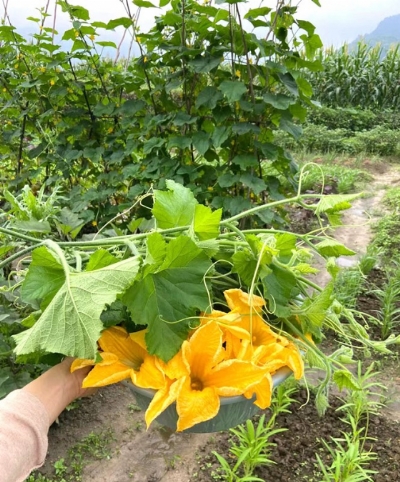 去年立秋之日,一个令我记忆犹新的日子。早上起床后我在小院散步时,忽然看到最高的南瓜架上黄灿灿一片。走近一看,一朵南瓜花迎着晨曦开得刚好,像是镶了颗硕大的珍珠。
