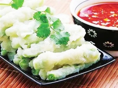 诸料齐备,就可以烧水做沾片子了。饭店为了美观,做玉谷叶的沾片子通常只沾一面,豆角也保持整根原形,这样出锅时白绿相间,蔬菜还保持着原状,看起来齐整漂亮。家常制作时,可以依个人喜好,把洗净的菜品改刀成大小适宜的形状。