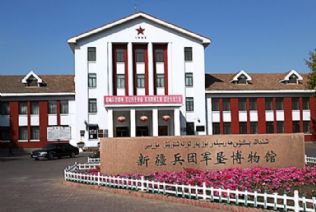新疆生产建设兵团军垦博物馆座落在石河子市游憩广场一旁,是一座并不显眼的建筑,但它却是全国唯一的以新中国屯垦戍边史为主要内容的博物馆。博物馆占地2800平方米,分三个展厅。进门的左侧是第一展厅,为“古代石河子”。这里陈列着在石河子地区出土的距今2000多年的陶罐、石器、化石、青铜器等。进门右拐是第二展厅,陈列着军垦事业“辉煌的历史”。百余件军垦战士垦荒时用过的农具,穿过的衣物及生活用品,向人们展示着军垦战士的垦荒史、创业史。给我印象最深的是“军垦第一犁”雕像。两人在前奋力拉犁,一人在后执掌铧犁,再现了当年“老军垦”一寸一寸在荒滩上开垦、耕作的景像。紧挨着的是第三展厅“足迹在延伸”。全面介绍了戈壁明珠石河子的发展历史,以及中央领导人来石河子视察的照片。最后就是那副镇馆之宝“半景画”了。所谓“半景画”就是一部分是真实物,一部分是油画制作的。走进大厅,当灯光熄灭,音乐响起的时候,给我一种震撼的感觉。这是一场没有硝烟的战争,画面上生动地展现了进驻新疆,建设新疆,保卫新疆的场景。